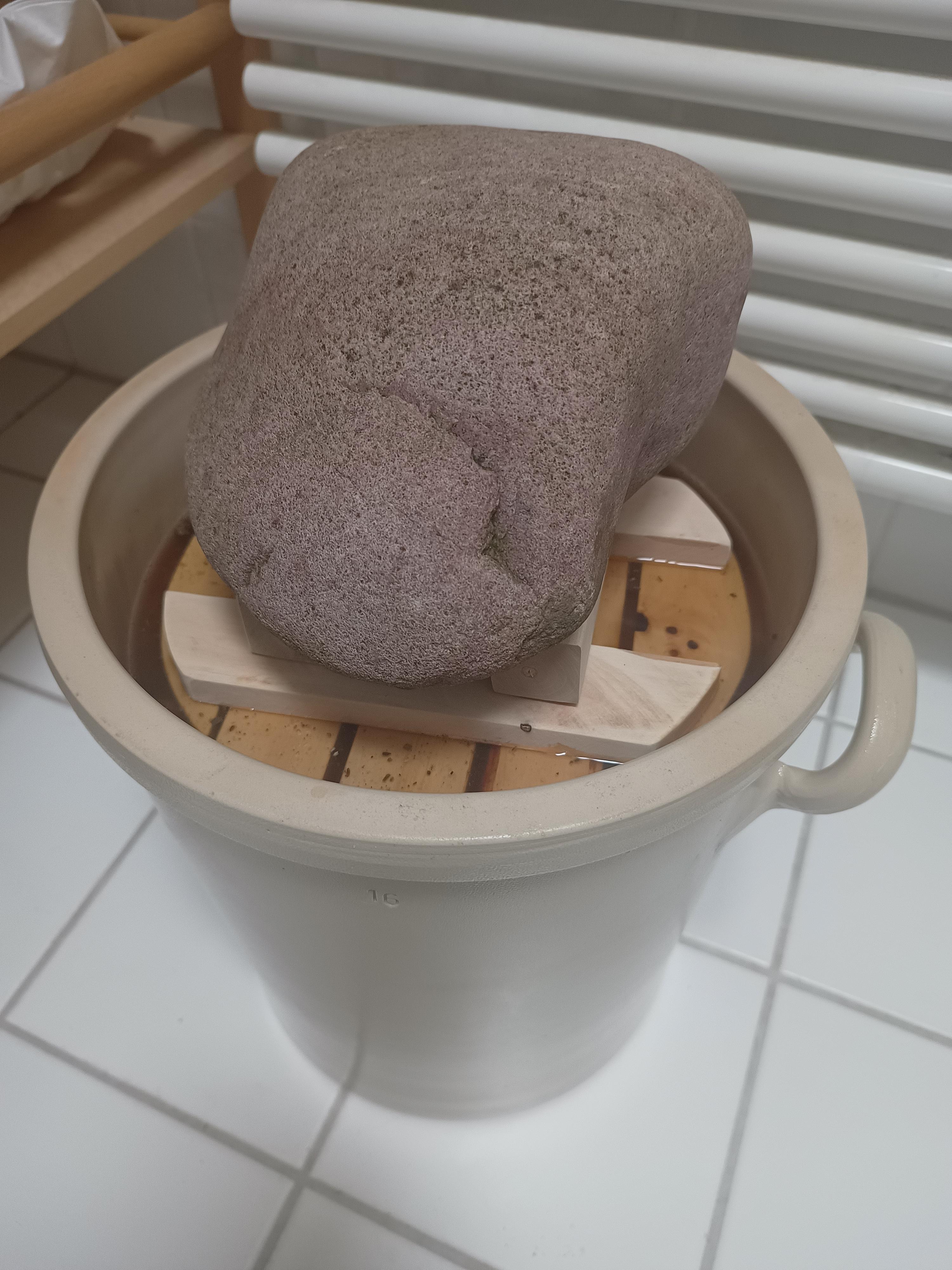 Das ist eigentlich die klassische Methode: Hier wird das Fleisch mit einem Deckel in einem Fass aus Keramik oder Holz zusammengepresst, damit es komplett mit Lake bedeckt ist.